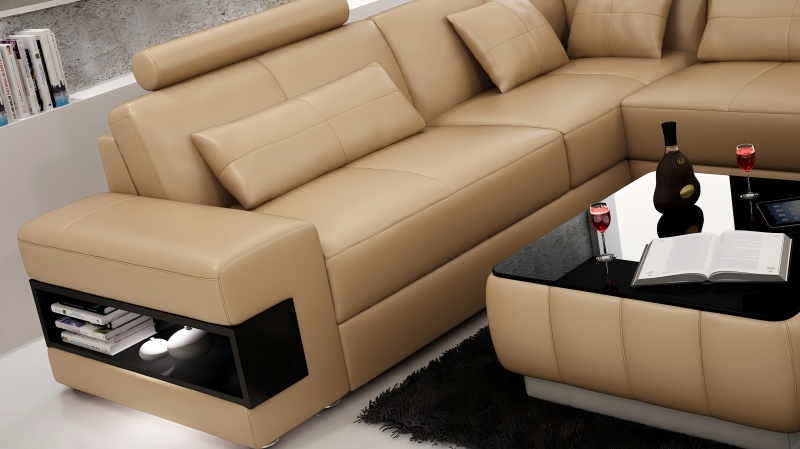 Este grande sofá de couro em forma de L é feito de couro de alta qualidade, que tem um toque delicado e suave. Ele está emparelhado com um design de linha minimalista e suave, elimina decorações desnecessárias e aprimora o estilo do espaço com uma textura discreta.